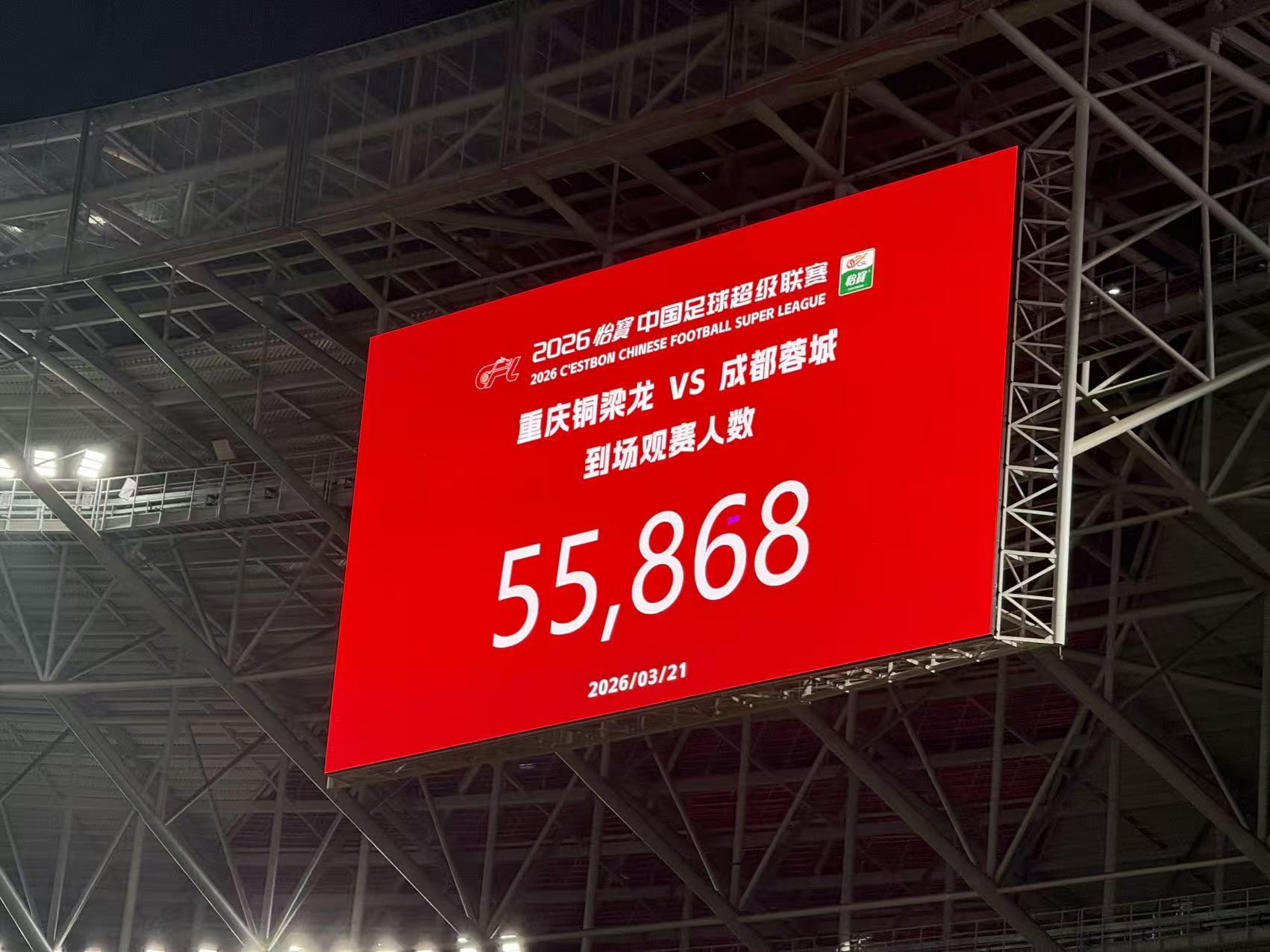 官方:重庆铜梁龙vs成都蓉城现场观众人数55868人