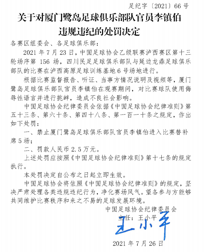 官方:厦门鹭岛官员李镇伯因在观赛期间挑衅比赛球队被禁赛