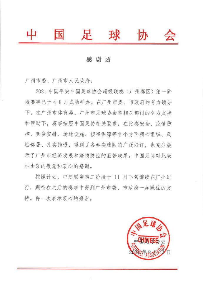 足协官方:感谢广州市委、市政府、市体育局对中超的支持