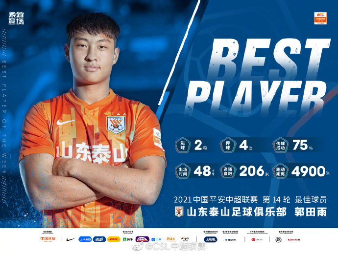 打入两球帮助泰山力克沧州,郭田雨当选第14轮MVP