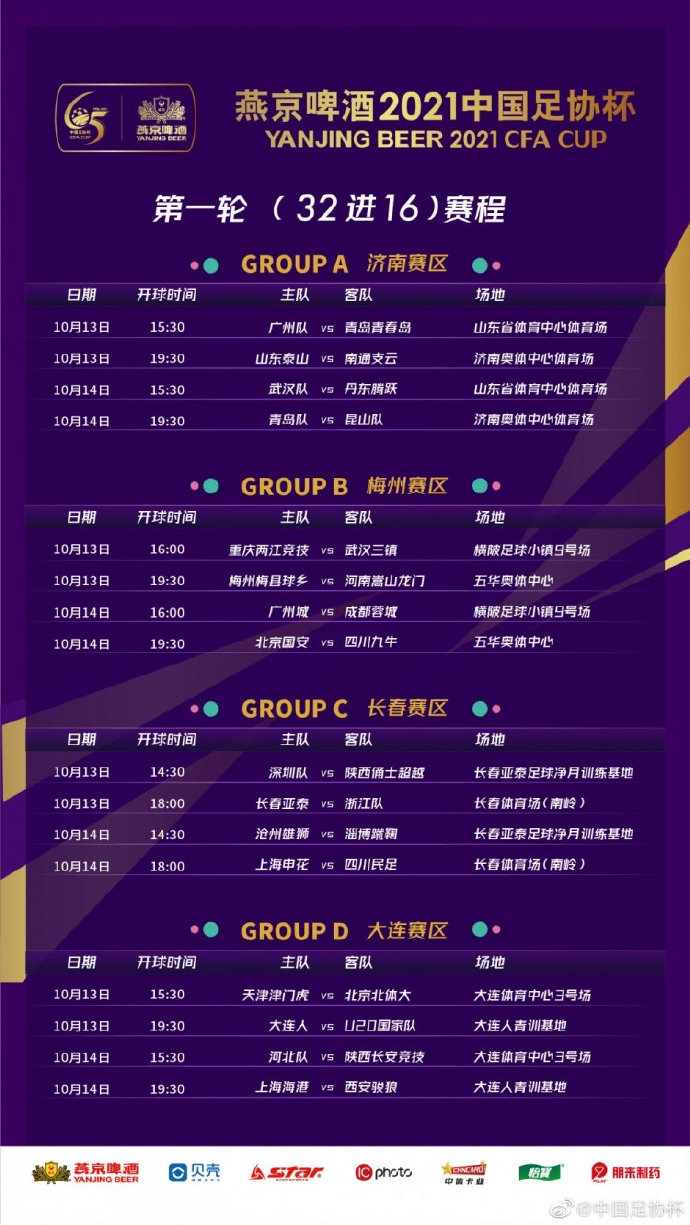 足协杯首轮赛程公布:广州队首战10月13日15:30战青岛青春岛