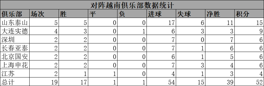 中超俱乐部亚冠对阵越南战绩:17胜1平1负