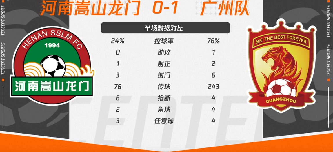 半场数据:广州队控球率为河南三倍,后者传球仅76脚