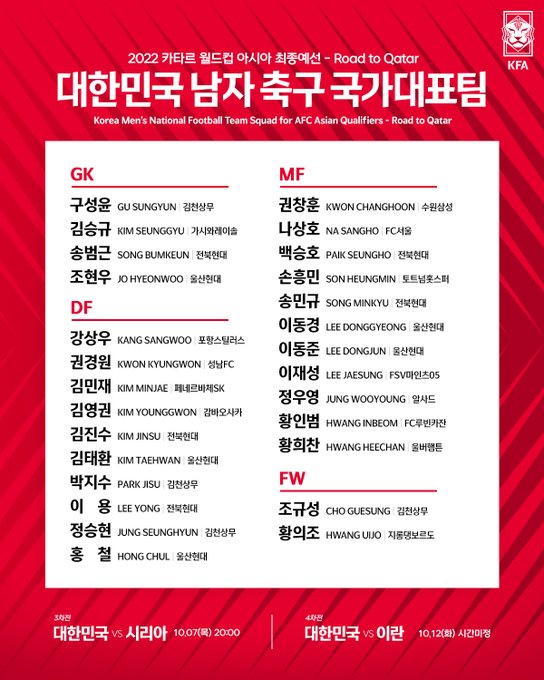 韩国公布10月世预赛大名单:孙兴慜领衔,黄义助黄喜灿在列
