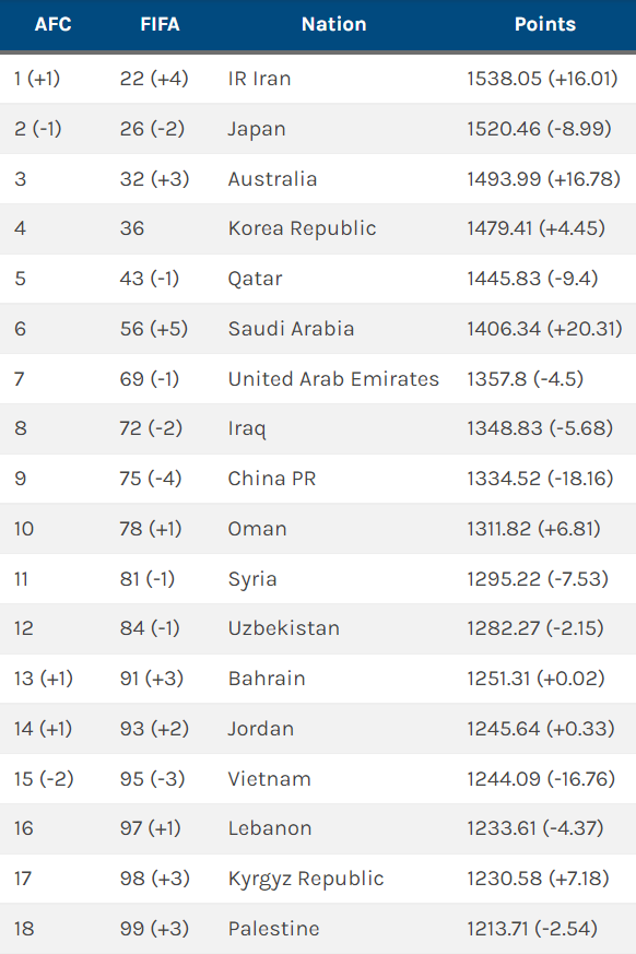 数据网站亚足联国家队排名:伊朗重返榜首,国足落至世界75