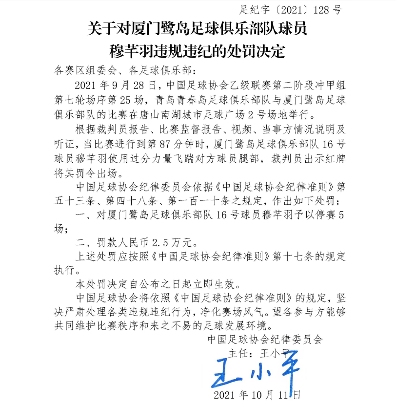 官方:中乙厦门鹭岛门将穆芊羽因飞踹对手被停赛5场
