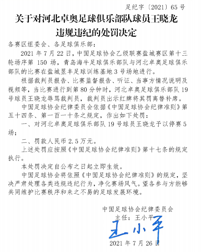 官方:河北卓奥球员王晓龙因辱骂裁判员被停赛5场并处以罚金