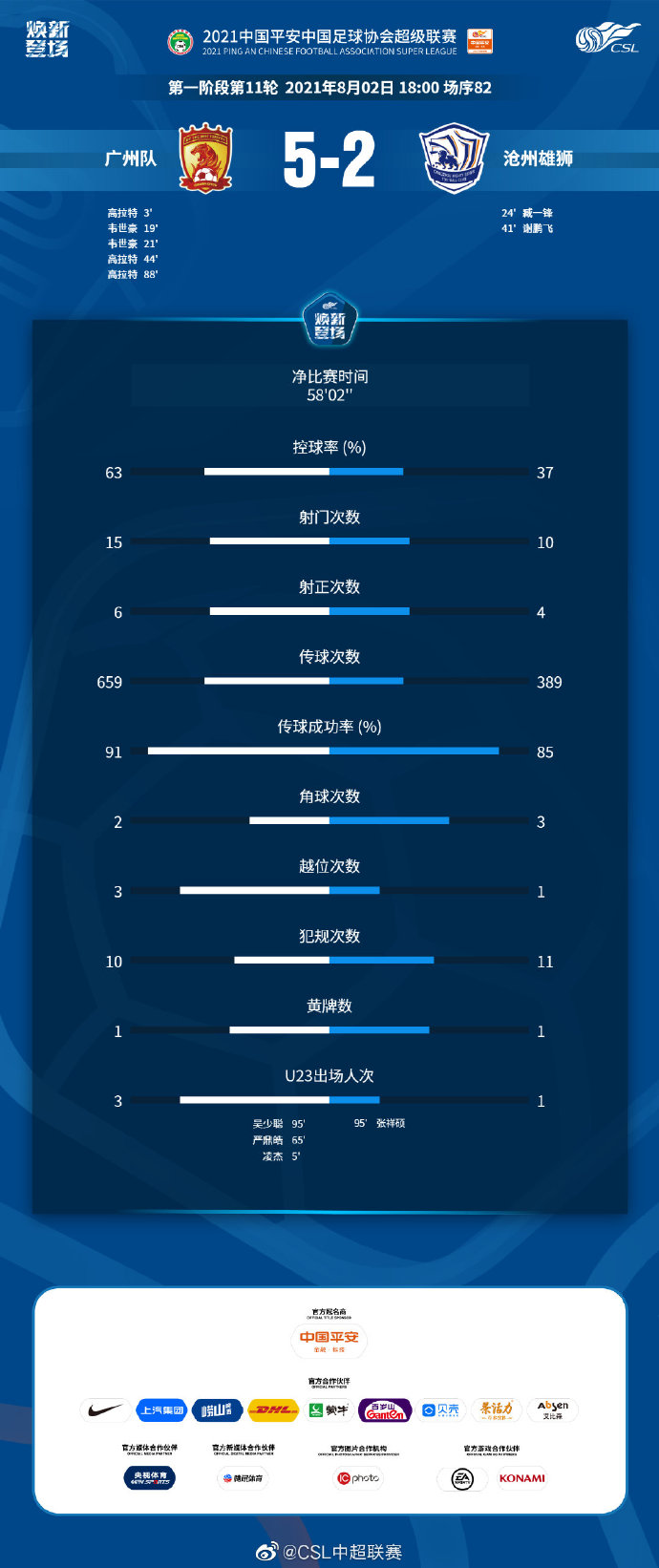 全场数据:广州队全面占优,净比赛时间58分02秒