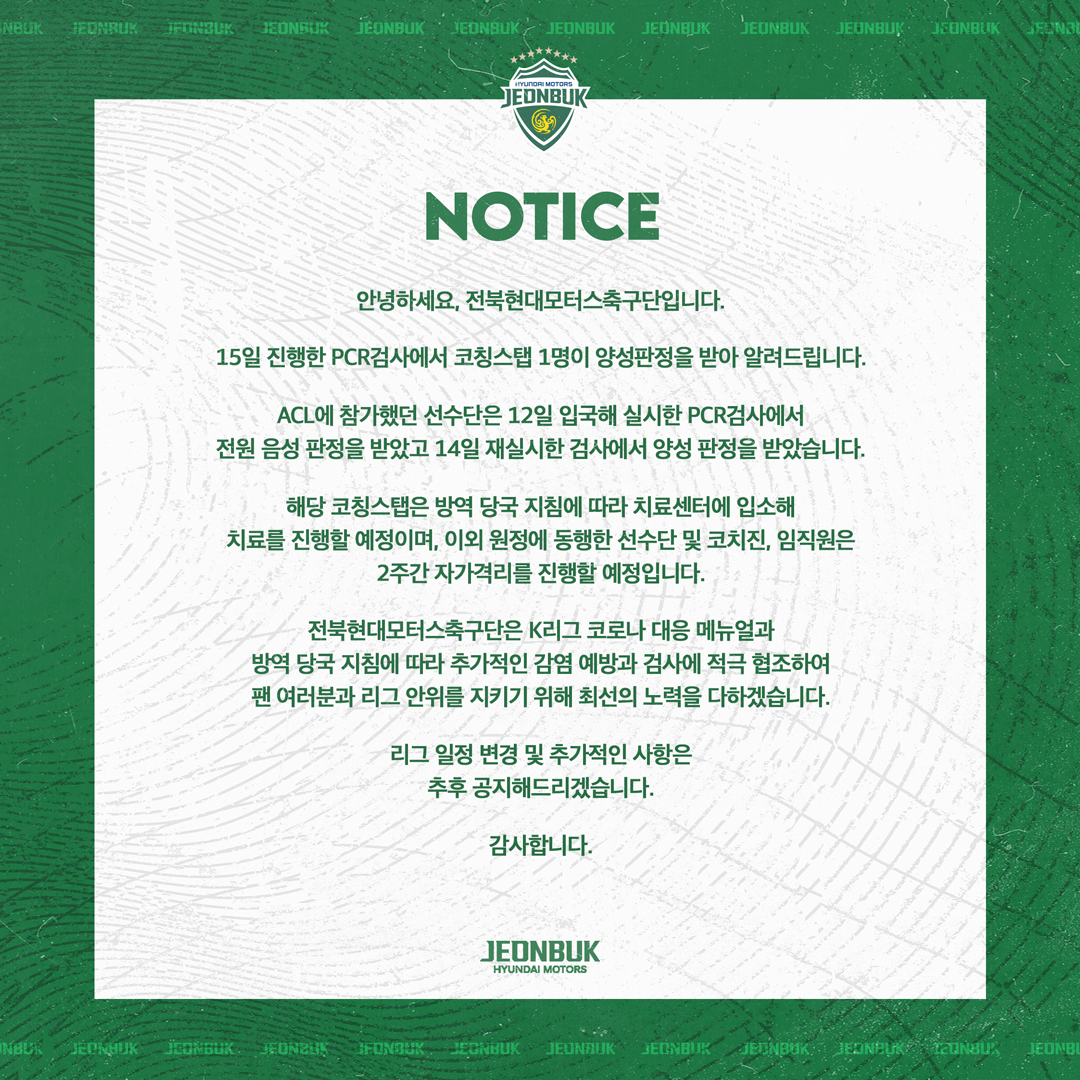 官方:全北现代1名教练组成员PCR检测呈阳性