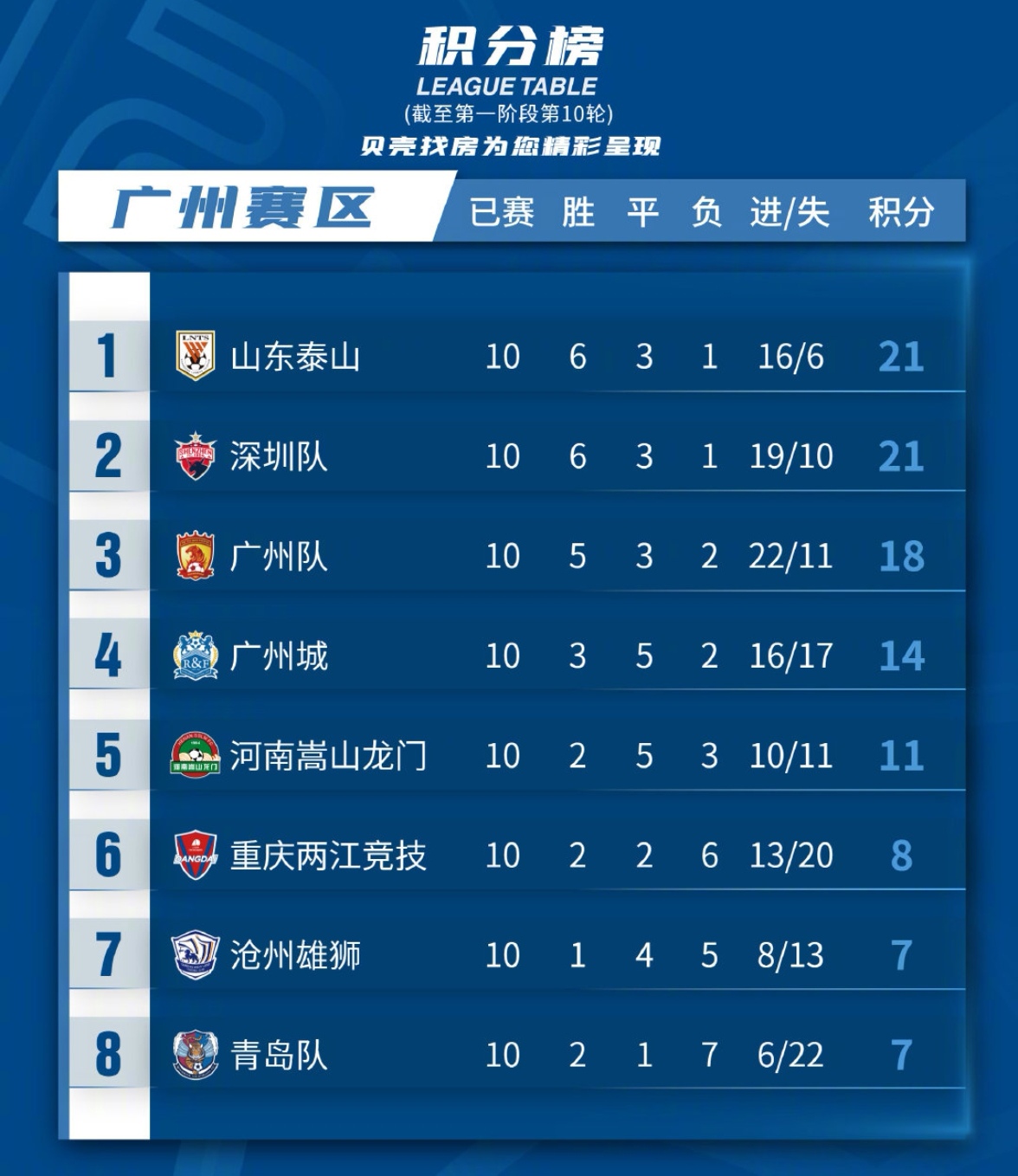 中超第10轮广州赛区积分榜:山东深圳领跑,沧州青岛垫底