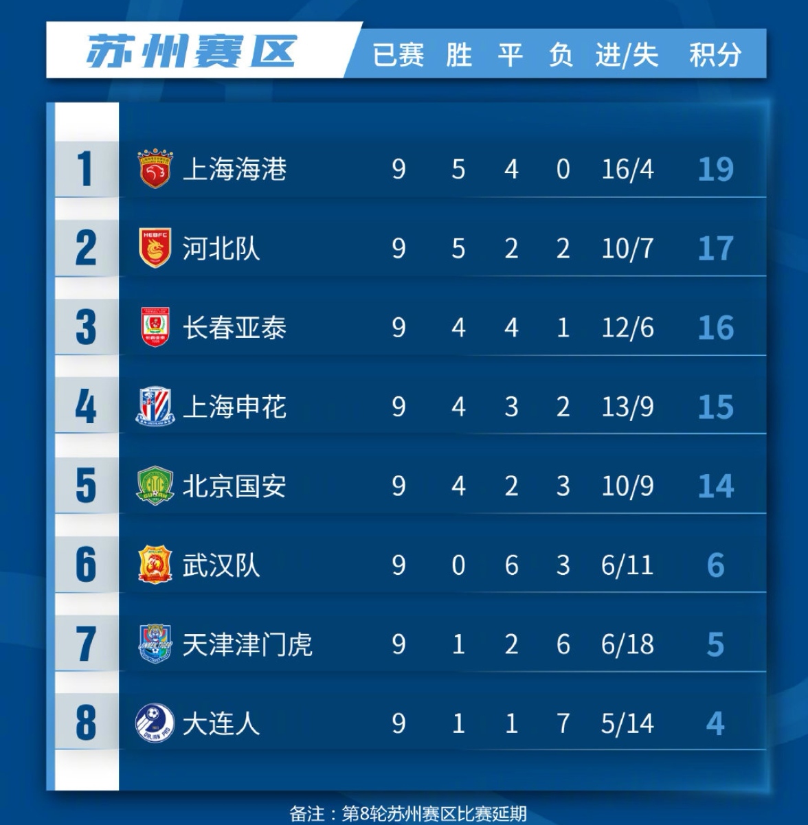 苏州赛区最新积分排名:国安重返争冠组,申花掉入保级组