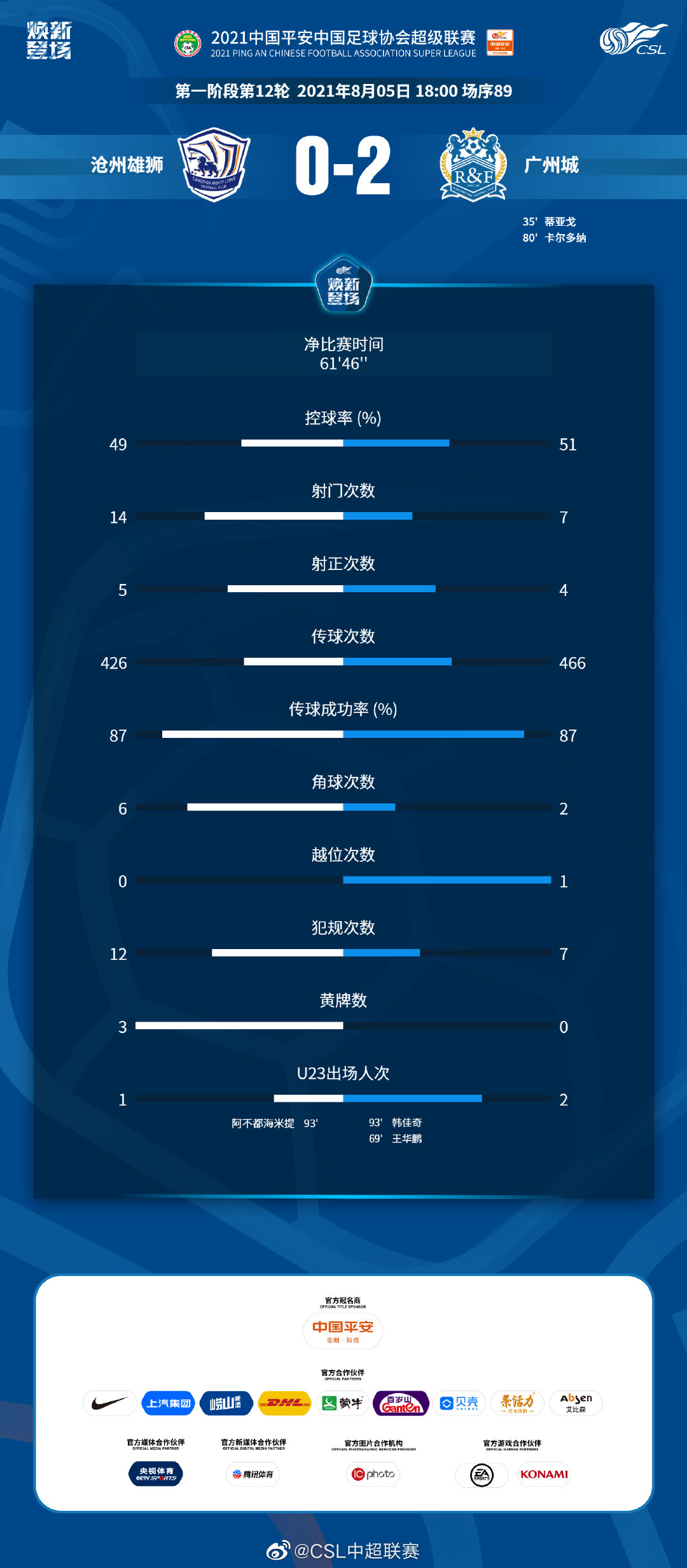 中超赛后数据:广州城射门少效率高,沧州雄狮犯规黄牌多