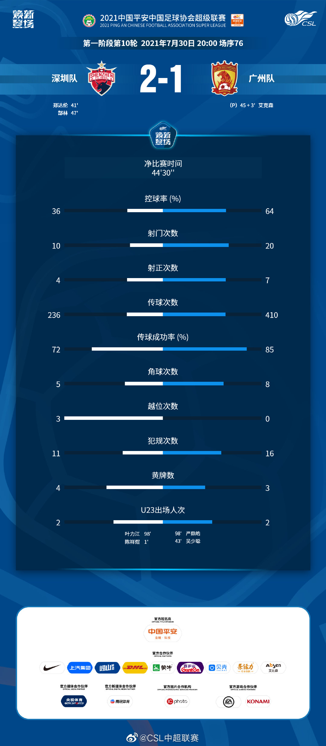 中超赛后数据:北京国安全面占优,大连人派出7名U23