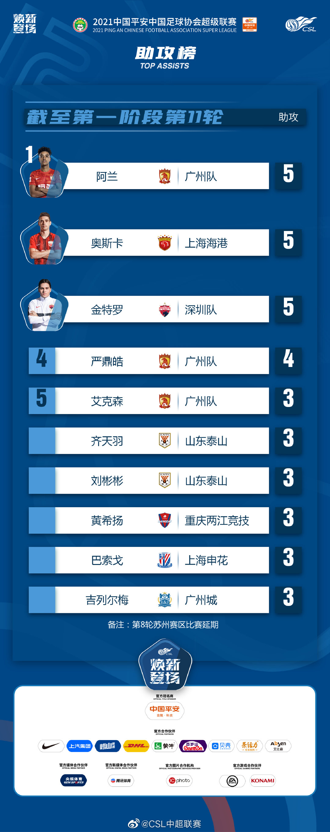 中超第11轮助攻榜:阿兰等人5次领跑,广州山东四人紧随
