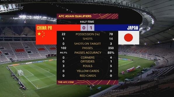 半场数据:中国日本射门1-14,国足传球成功率不足50%