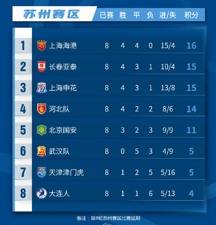 苏州赛区积分榜:海港不败独占鳌头,武汉难求一胜进球最少