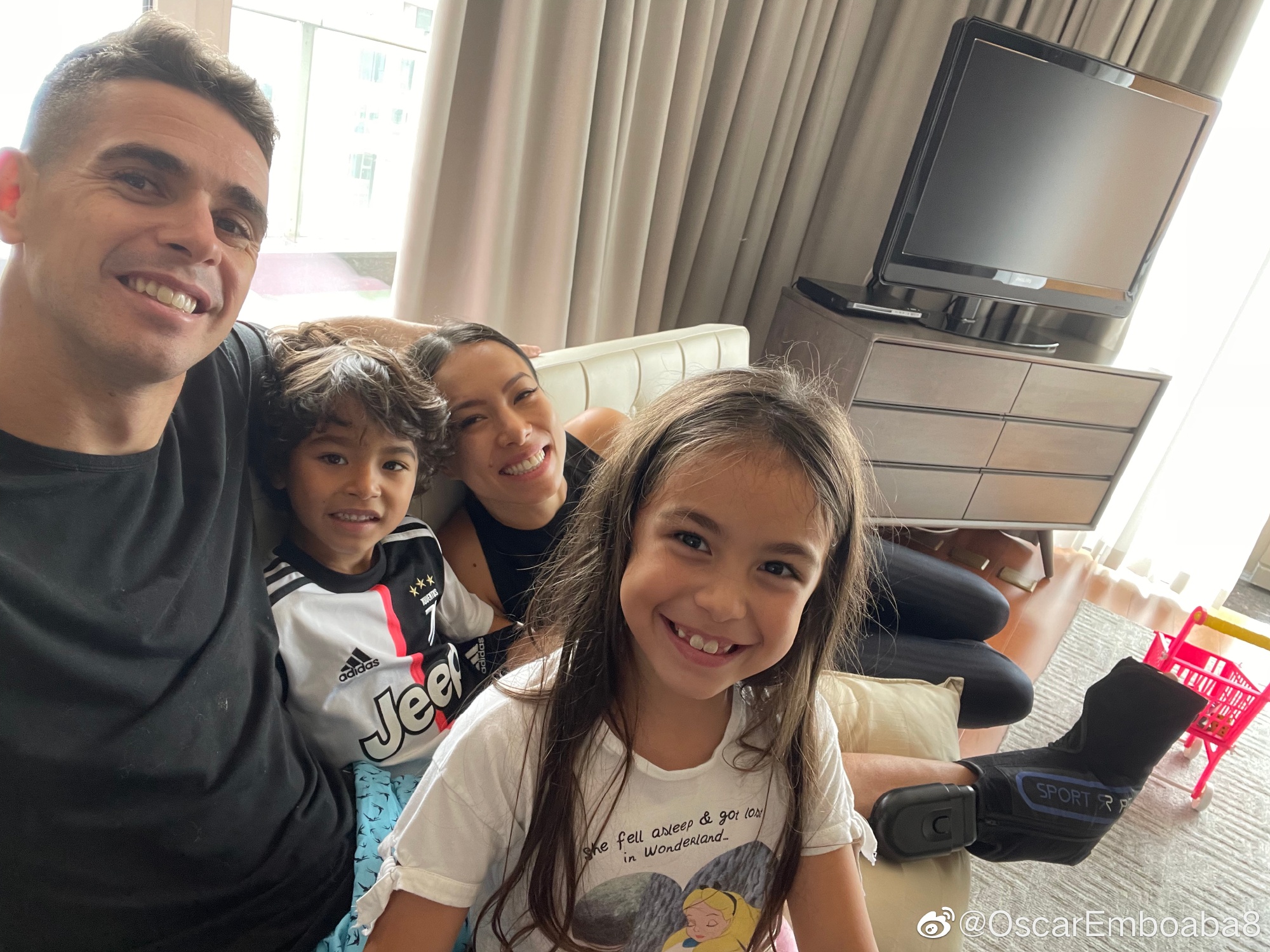 奥斯卡微博晒与家人合影,儿子身着C罗球衣