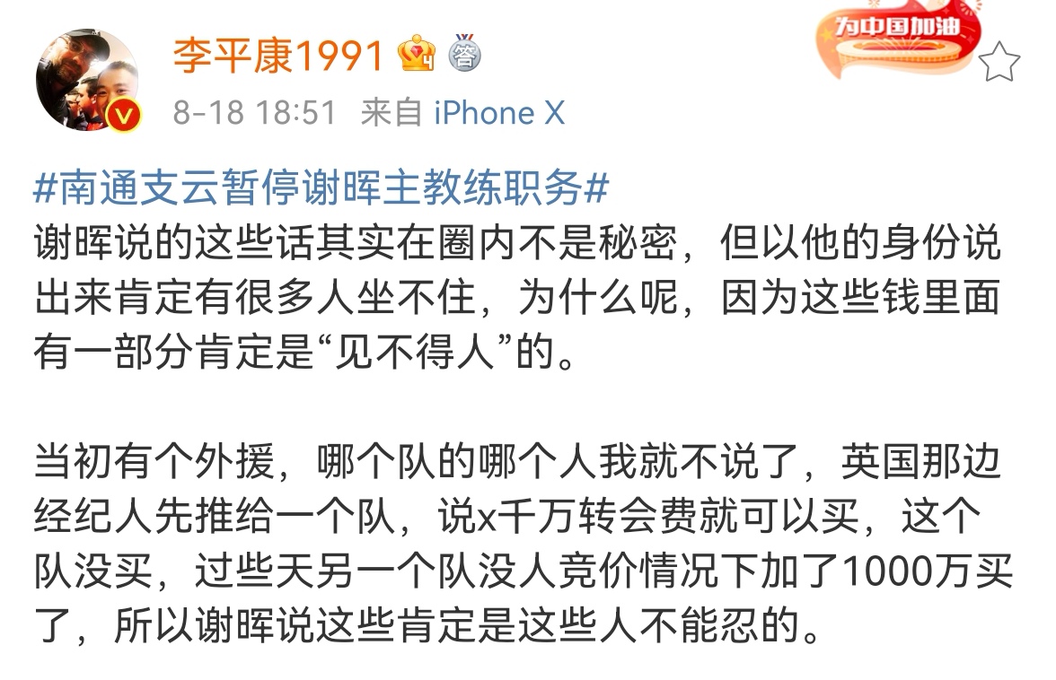 南通支云官方:主帅谢晖酒后发表错误言论,即日起停职