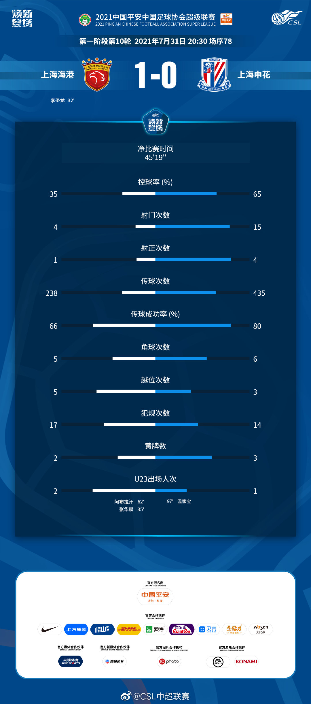 中超赛后数据:海港唯一射正即得分,申花进攻占优效率不佳