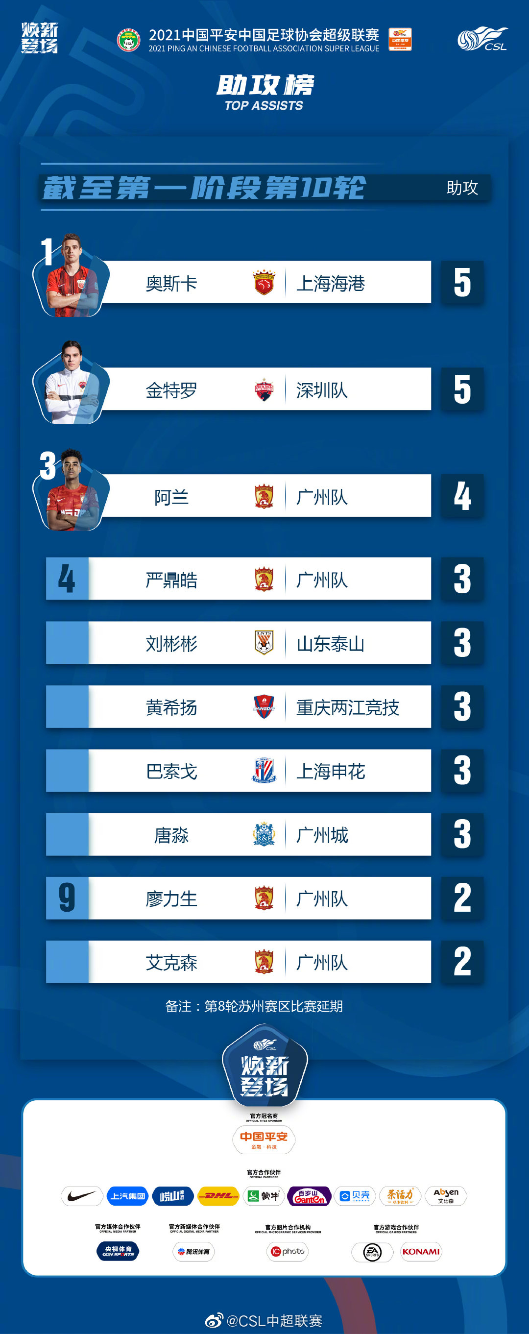 中超第10轮助攻榜:奥斯卡金特罗领跑,广州队4人上榜