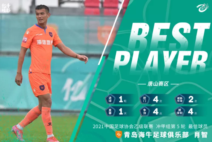 老当益壮,青岛海牛队员肖智当选中乙冲甲组第5轮最佳球员