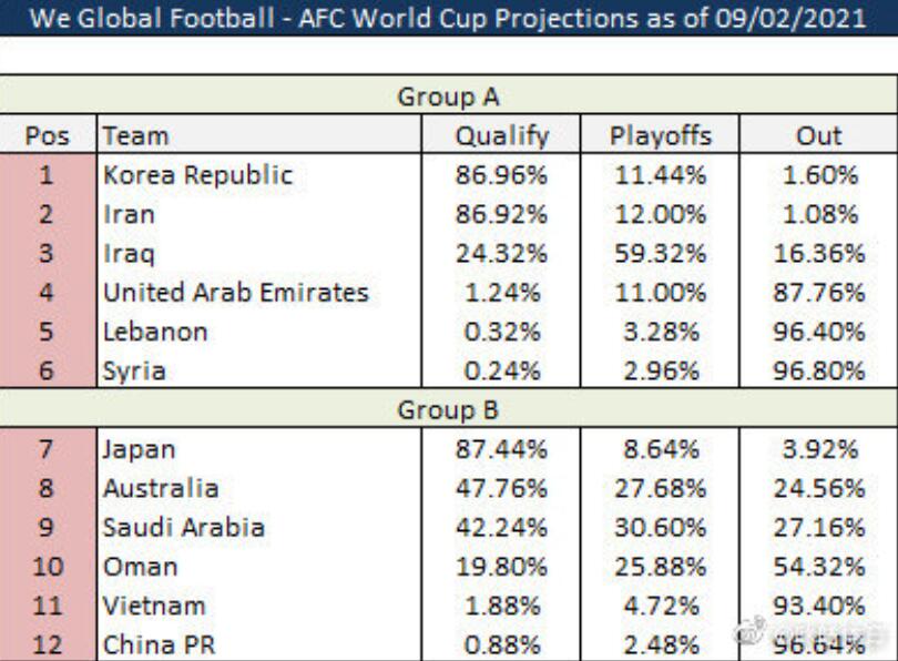 国足0-3澳大利亚,外网计算国足出局概率为96.64%