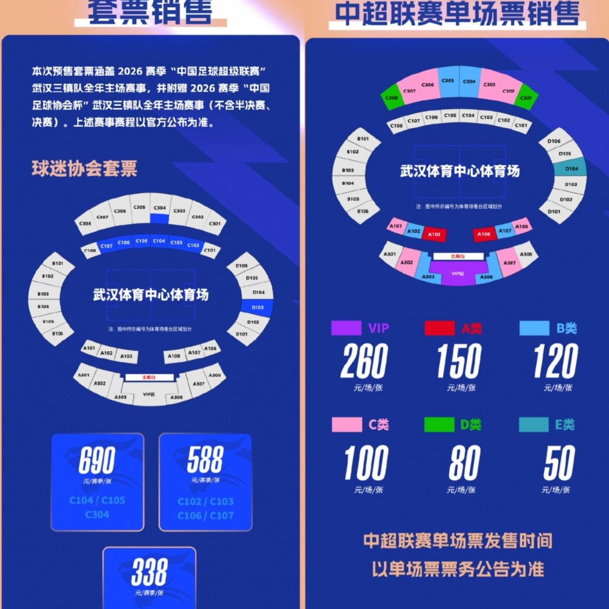 武汉三镇新赛季票价:单场50元-260元,套票799元-2499元