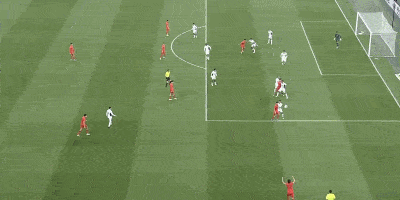 韦世豪间接任意球大力射门,被防守球员封堵出底线