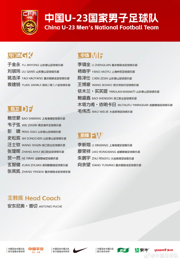 U23国足名单:向余望、彭啸、于金永入选,李昊缺席