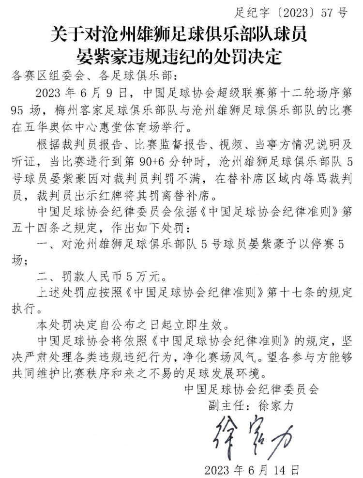 足协官方:沧州雄狮球员晏紫豪辱骂裁判,罚款5万并停赛5场