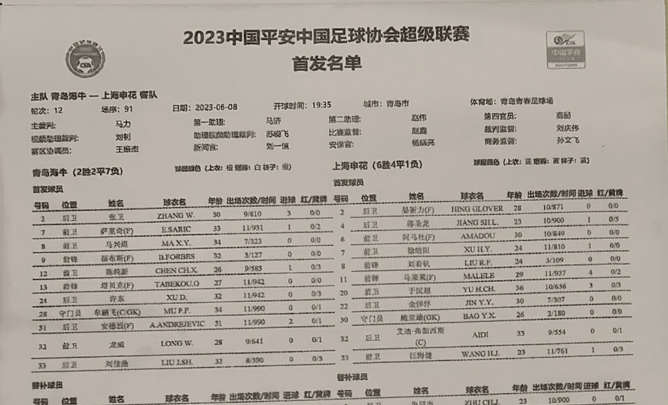青岛海牛vs申花首发:福布斯PK马莱莱,汪海健、刘若钒出战