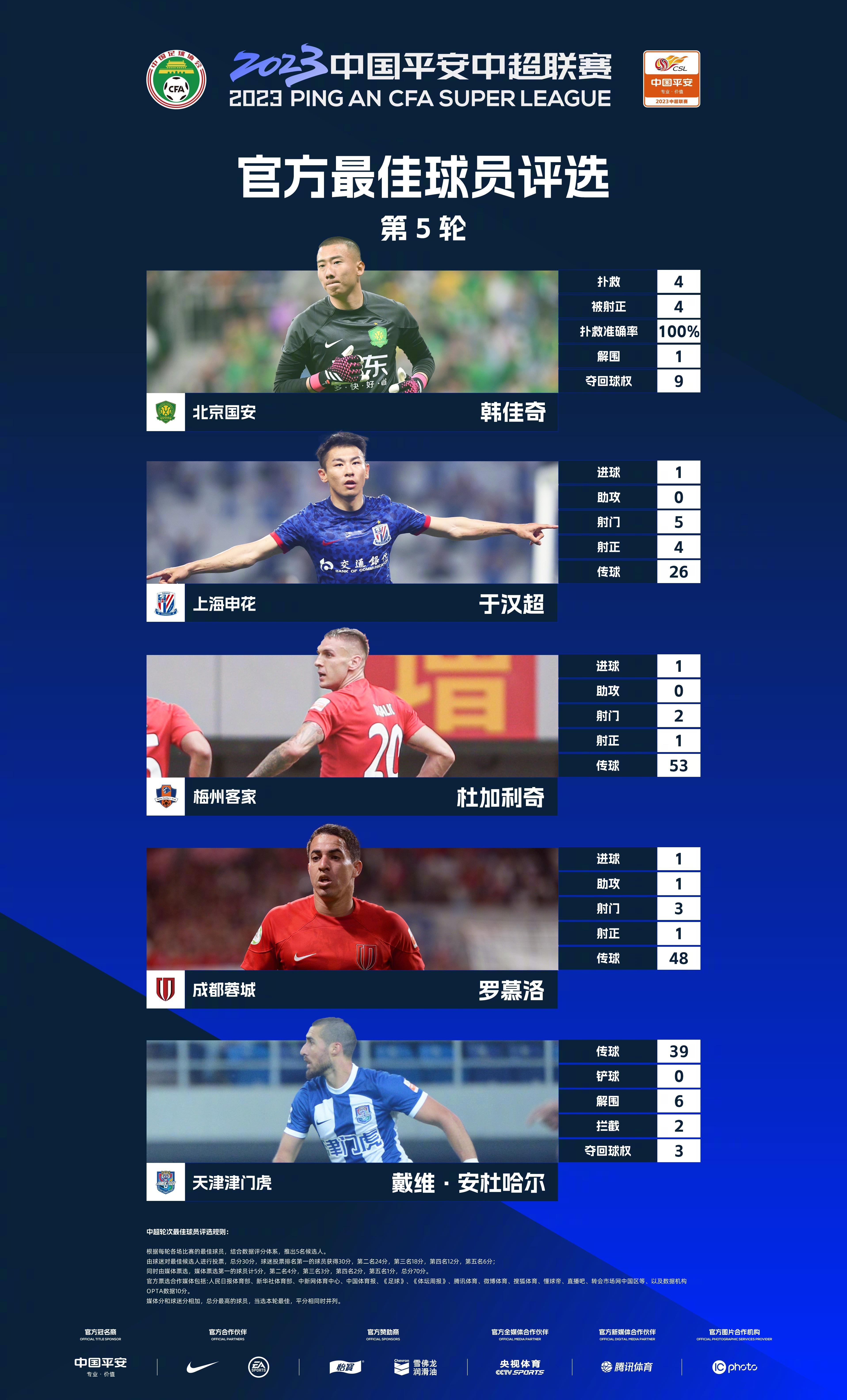 中超第5轮最佳候选:韩佳奇、于汉超、杜加利奇等5人入围