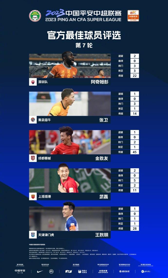 中超第7轮最佳候选:阿奇姆彭、张卫、武磊等5人入围