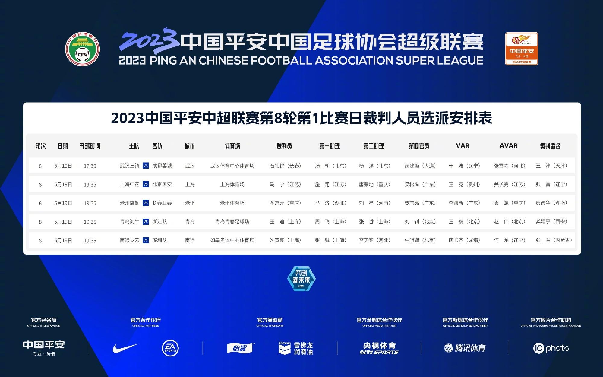 今日裁判:马宁执法申花vs国安,石祯禄执法三镇vs蓉城