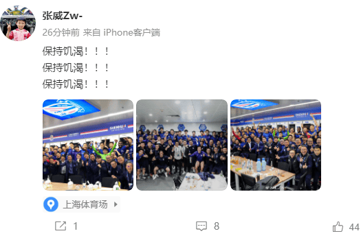 张威在社媒晒球队庆祝照,并配文:保持饥渴!