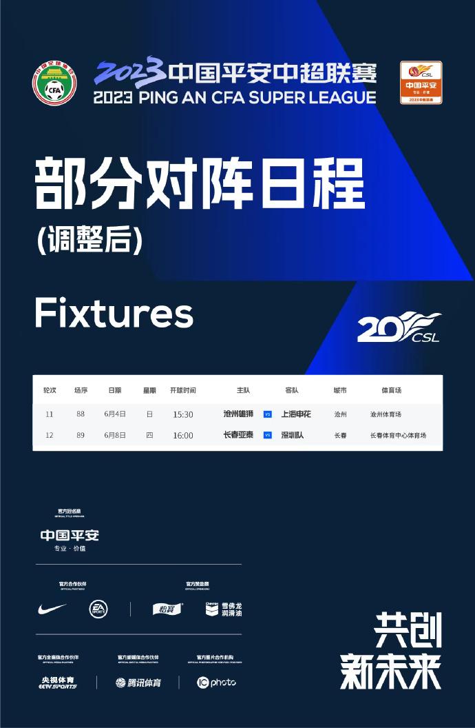第11轮沧州vs申花、第12轮亚泰vs深圳队开球时间调整
