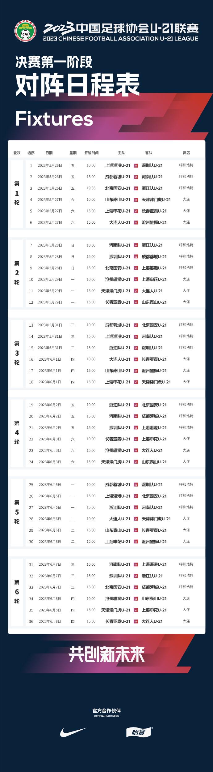 U21联赛决赛第一阶段赛程:5月26日至6月8日进行6轮比赛