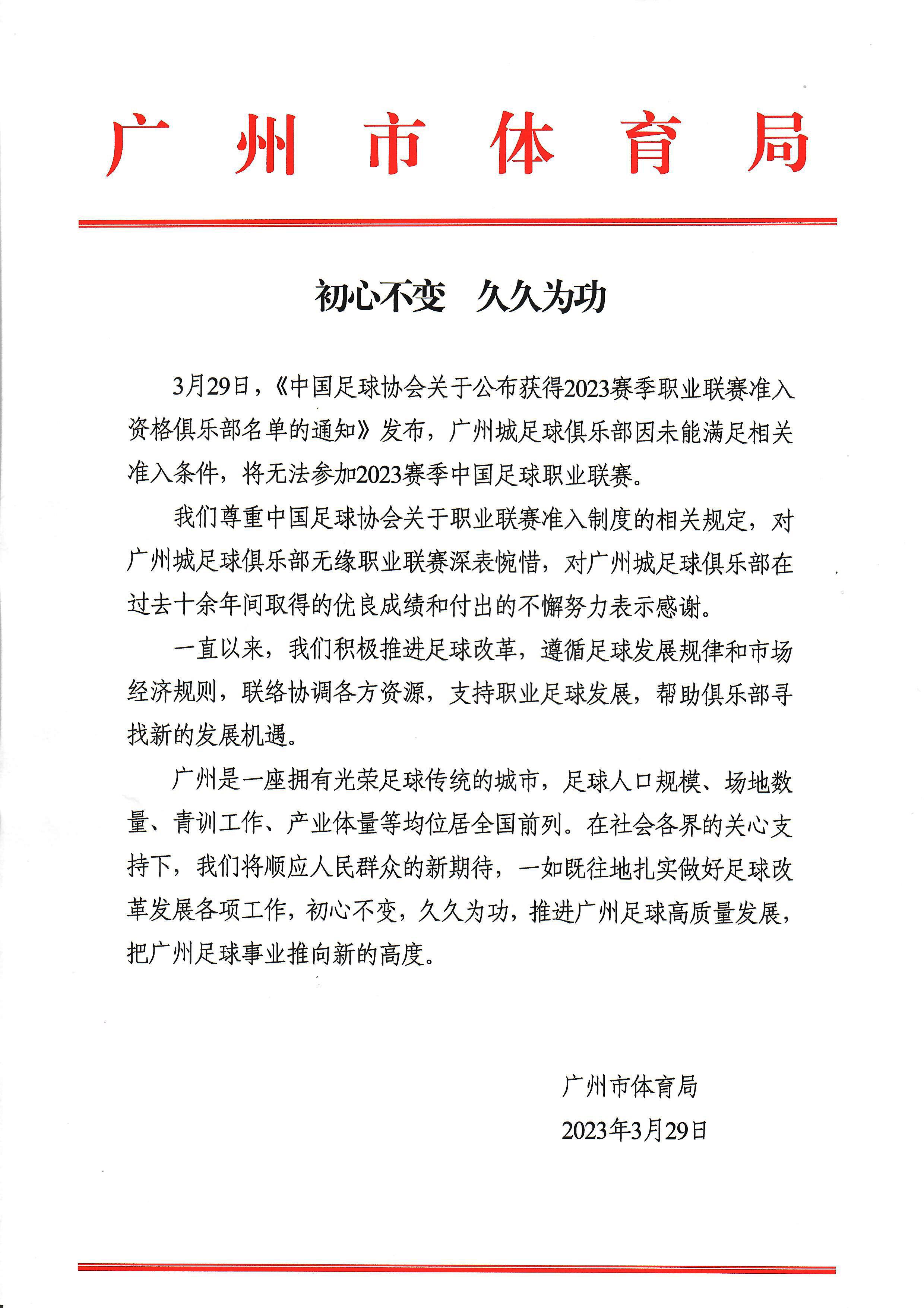 官方:广州城足球俱乐部即日起暂停运营