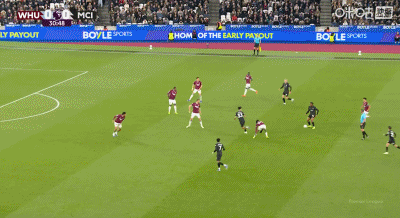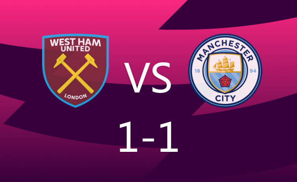 半场:西汉姆1-1曼城,B席吊射破门,马夫罗帕诺斯扳平
