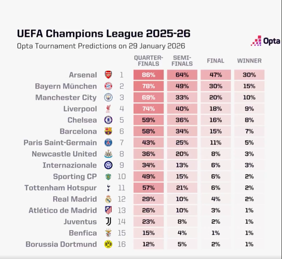 OPTA更新欧冠夺冠概率:阿森纳30%断层领跑,拜仁15%次席