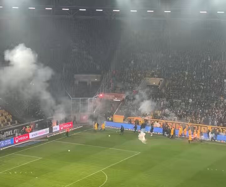 德乙焦点战失控&比赛一度中断:球迷冲场扯旗,双方互掷烟火