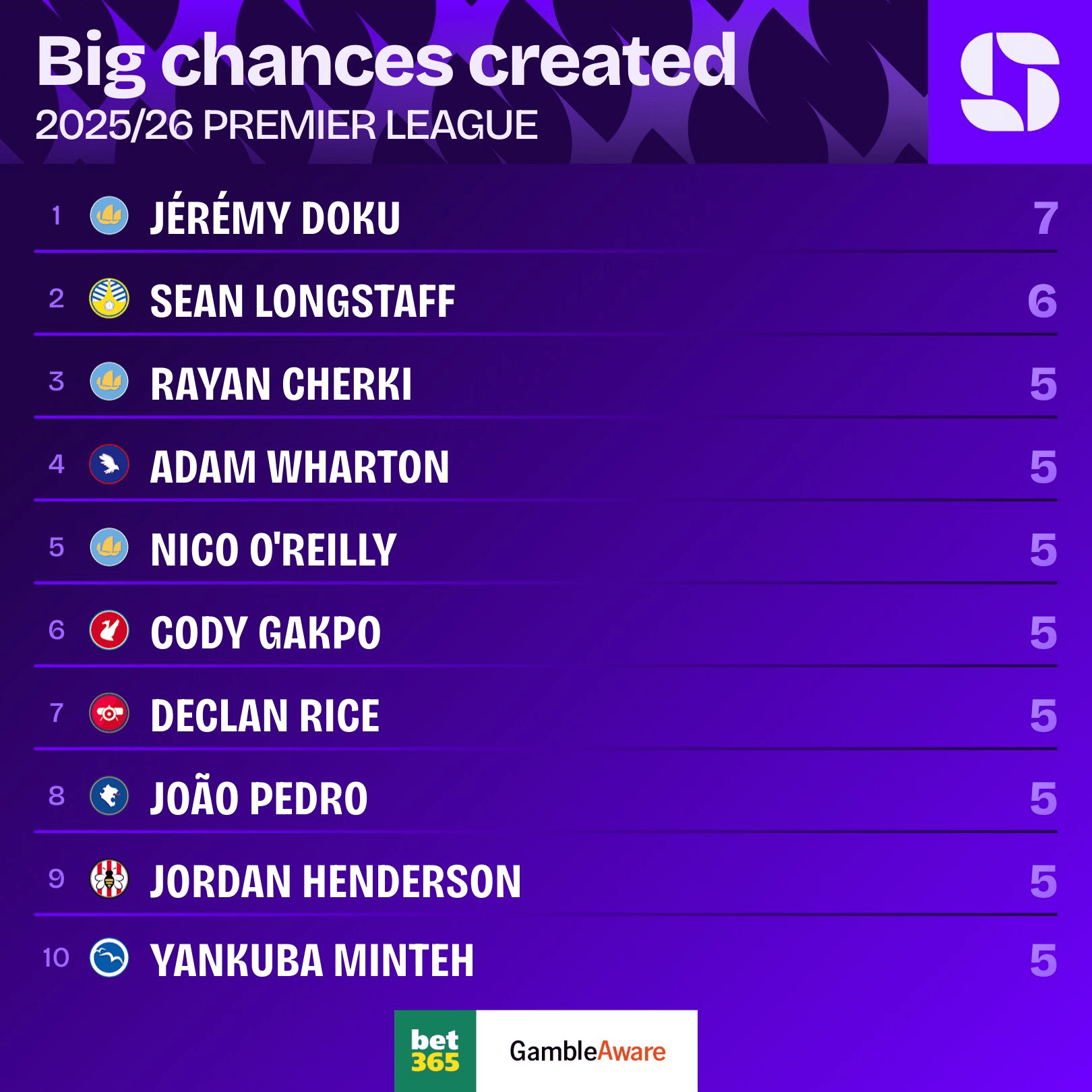 英超创造良机榜:多库领跑朗斯塔夫次席,谢尔基并列第三