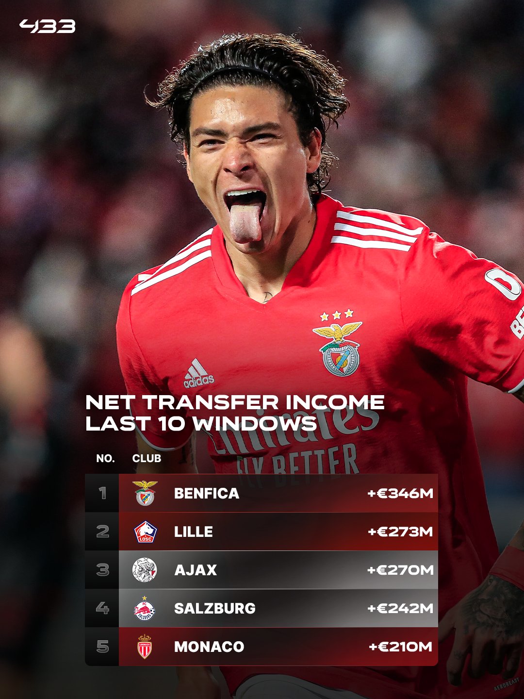 近10个转会窗口转会净收入排行:本菲卡领衔,葡超3队在列