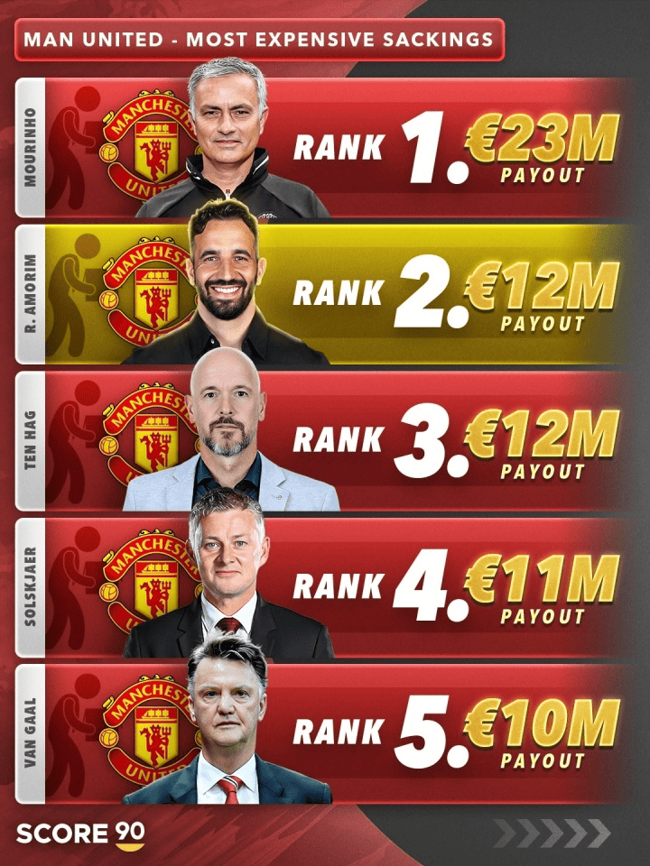 曼联解雇教练的花费:穆里尼奥23M欧最高,阿莫林&滕哈格前3