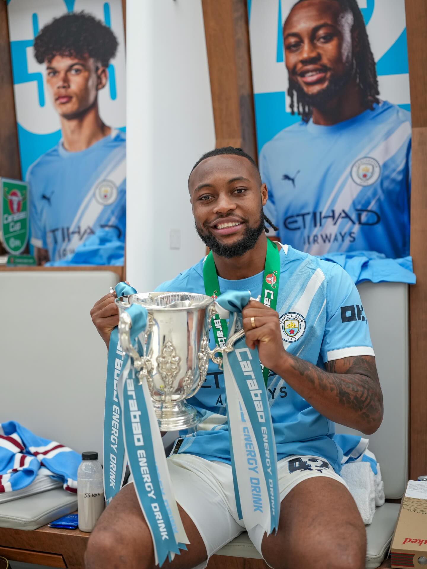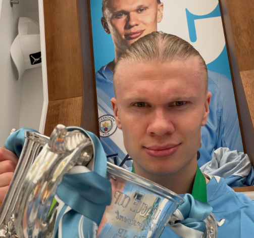 分享喜悦,哈兰德社媒晒与联赛杯冠军奖杯的合影:🩵