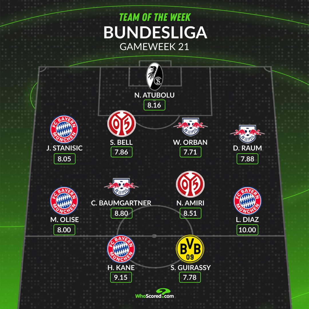 WhoScored本轮德甲最佳阵容:迪亚斯满分领衔,红牛三将在列
