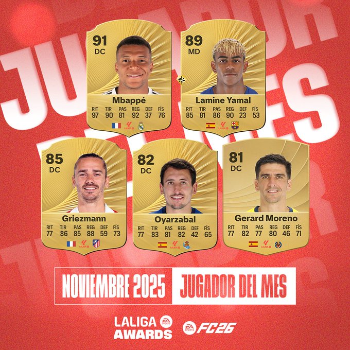 西甲11月最佳球员候选:姆巴佩、亚马尔、格列兹曼在列