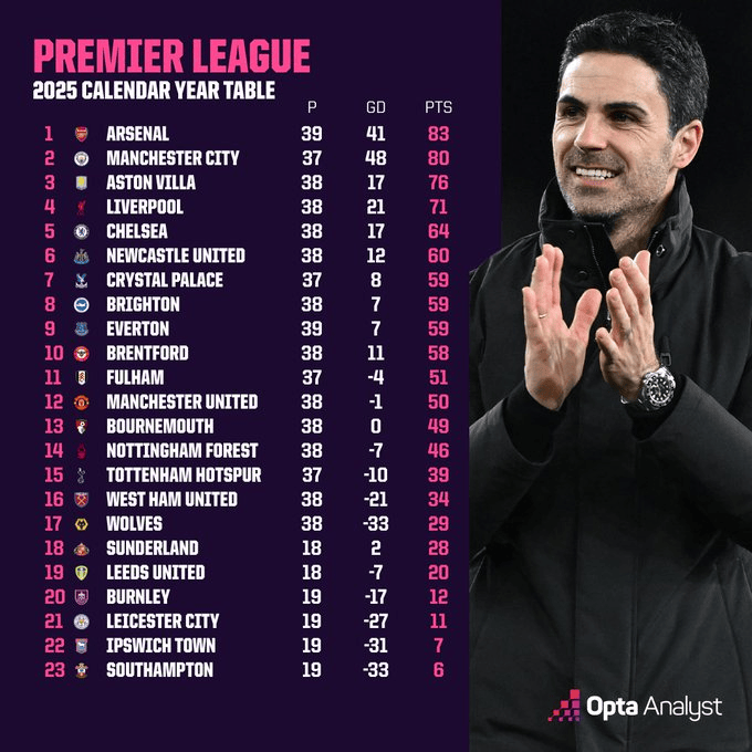 英超2025年积分榜:阿森纳83分第1,曼城第2红军第4曼联第12