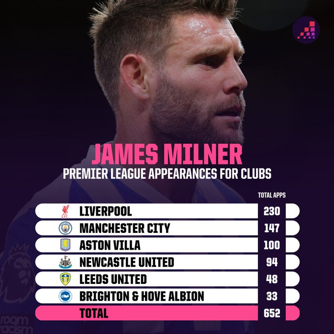 一步之遥!米尔纳今晚有望追平巴里653场英超历史出场纪录