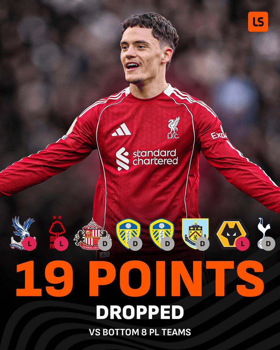 扶贫!利物浦本赛季面对目前积分倒数前八球队累计丢达19分